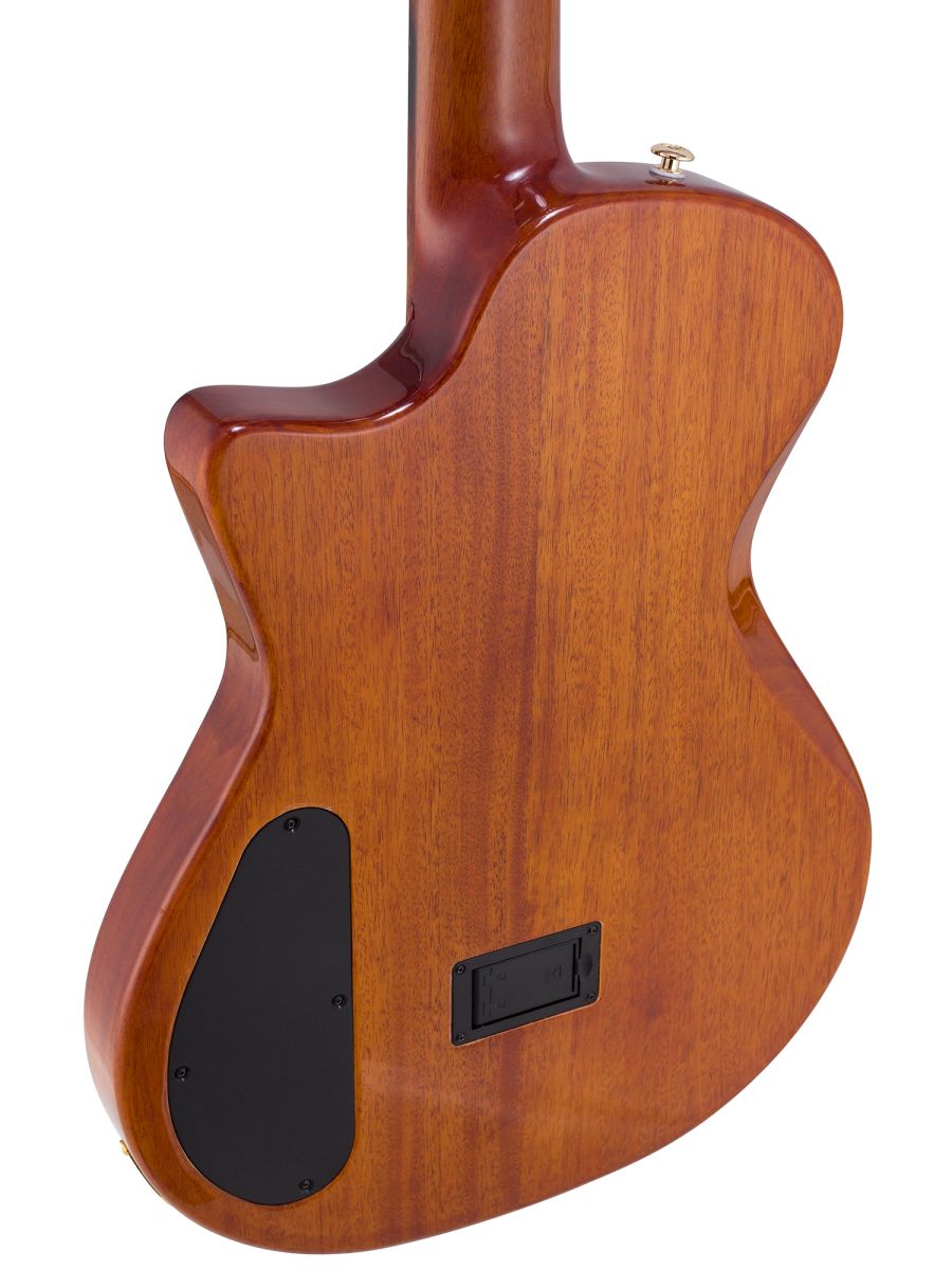 Серия: Fusion Craft Форма корпуса: Hollow Body with Cutaway Мензура: 650 мм (25 19/32”) Ширина грифа на нулевом ладу: 48 мм (1 57/64”) Ширина порожка: 45 мм (1 49/64") Корпус: махагони Верхняя дека: ель с шпоном из огненного окуме класса 5A Гриф / накладка грифа: махагони / макассарский эбен Анкерный стержень: двухсторонний Лого на голове: гора Бромо, перламутр Оформление резонаторного отверстия: «Ковбойская веревка» Бридж: "Орлиное крыло", черное дерево Amara Лады: 22 Верхний и нижний порожки: кость Колки: винтажные "Mt. Bromo", позолоченные Электроника: пьезодатчик + 3-позиционный звукосниматель под струнодержателем Отделка: глянцевый лак Цвет: Trans Black В комплекте: утепленный жесткий кейс