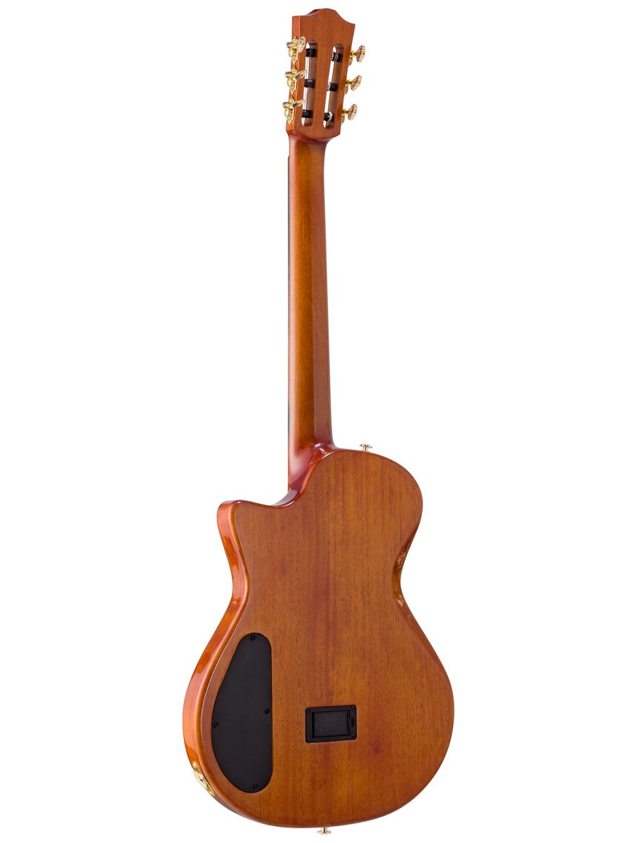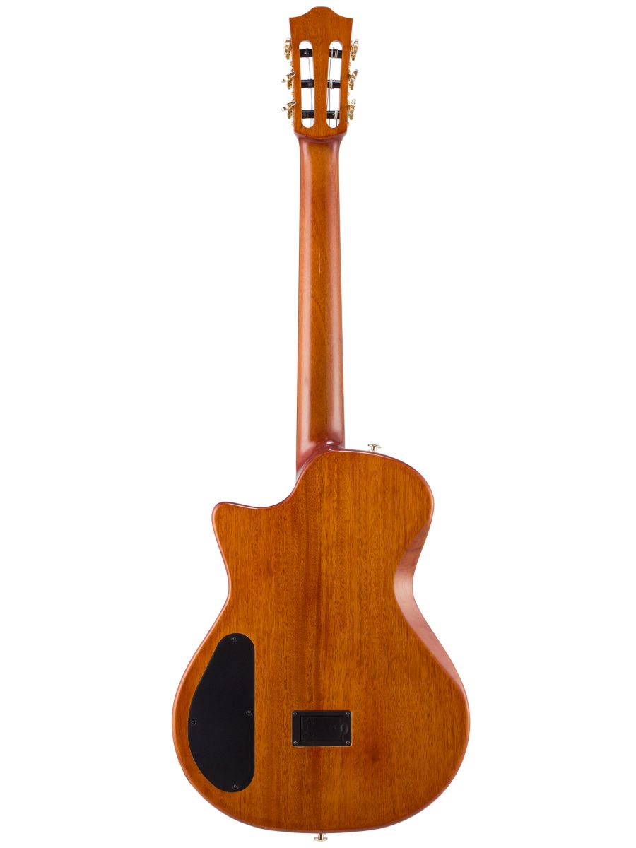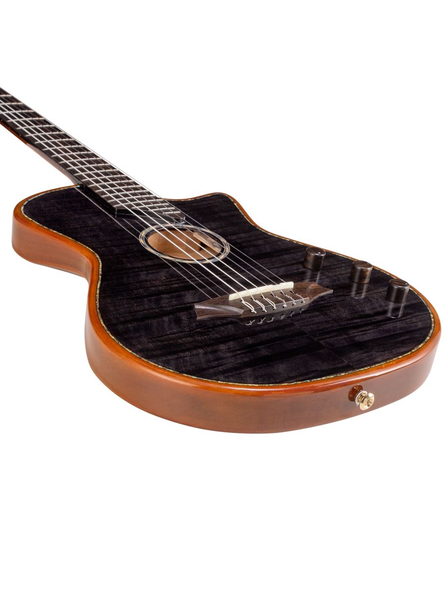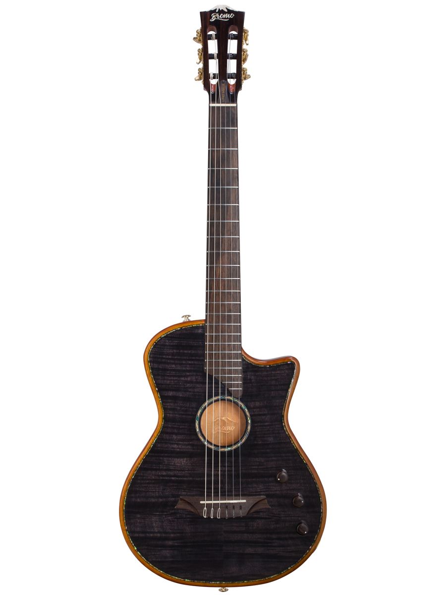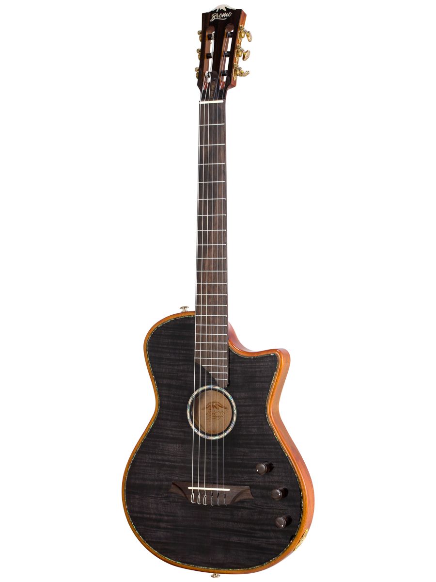 Bromo BEN2CTBK Гитара полуакустическая с нейлоновыми струнами, корпус: махагони, верхняя дека: ель с шпоном из огненного окуме класса 5A, гриф: махагони, накладка грифа: макассарский эбен, двухсторонний анкер, колки: винтажные, «Mt. Bromo» позолоченные, электроника: пьезодатчик + 3-позиционный звукосниматель под струнодержателем, глянцевый лак, цвет: Trans Black, в утепленном жестком кейсе
